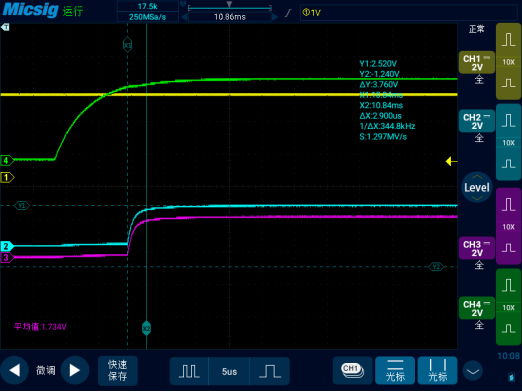 其中部分测试波形如下:(示波器通道1(黄色)接VIO,通道4(绿色)接VCC,通道2(蓝色)CANH,通道3(紫色)接CANL)