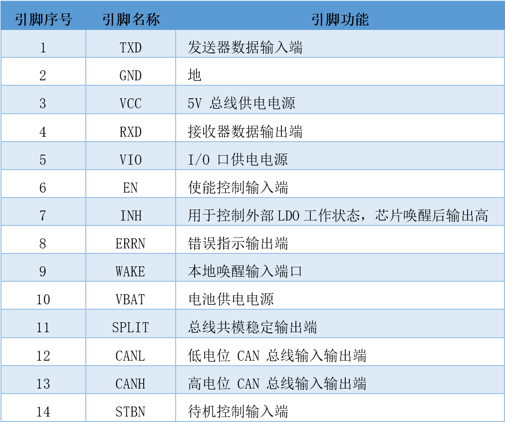 完全兼容“ISO 11898-2:2016”标准,±30V接收器共模输入电压,总线端口耐压可达±58V,支持5Mbps CAN FD(灵活数据速率)的高速 CAN,带共模稳定输出引脚SPLIT,从TXD至RXD典型环路延时约100ns,未上电节点不干扰总线,收发器在没有VBAT时下会脱离总线(零负载),工作在温度-40℃至 150℃结温范围。
