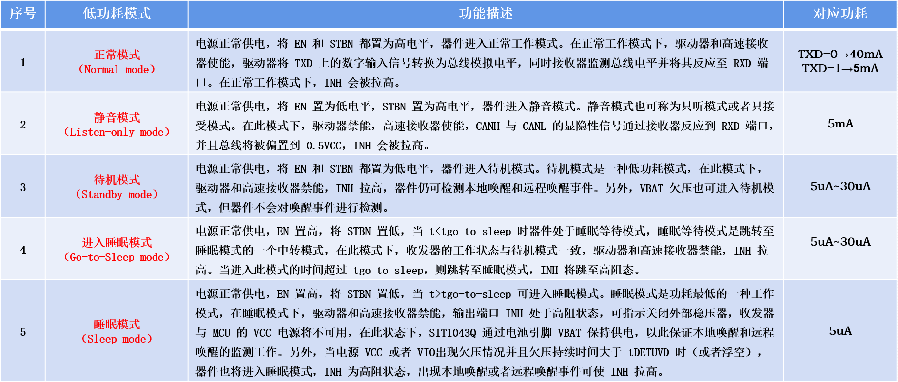 图4:SIT1043Q五种低功耗模式及功耗